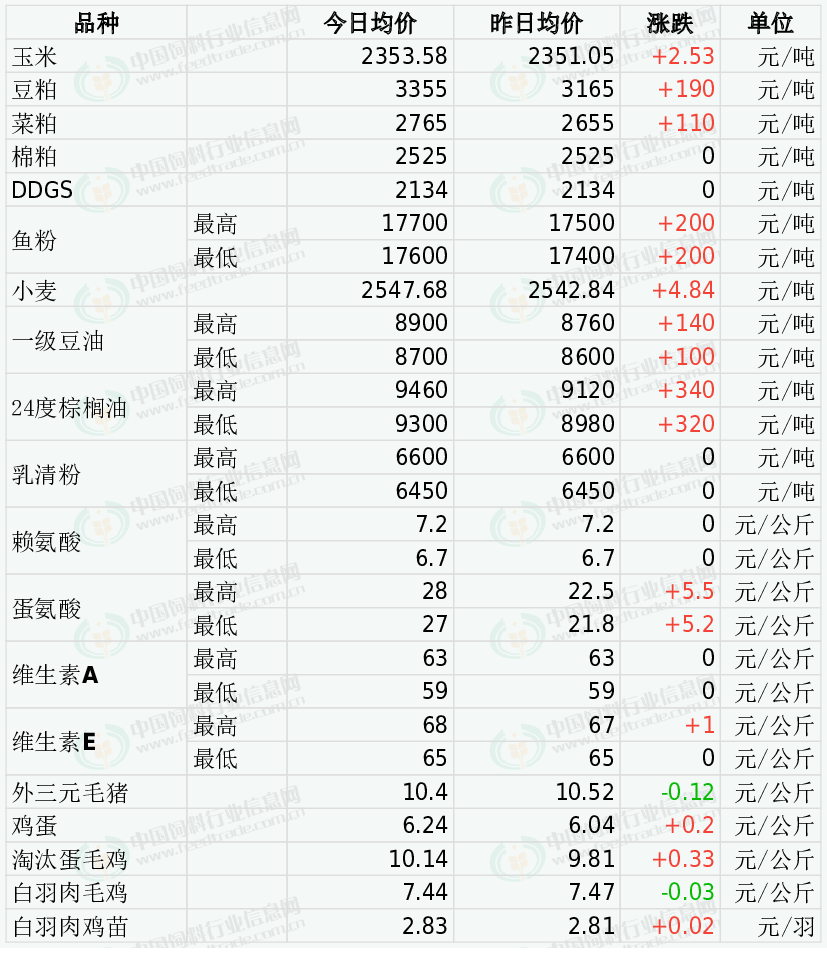 同时,菜粕现货价格也上涨了110元。其中东莞2660元/吨,沈阳2950元/吨,南通港2690元/吨,武汉2820元/吨,天津2750元/吨,昆明2840元/吨,成都2830元/吨,合肥2670元/吨。